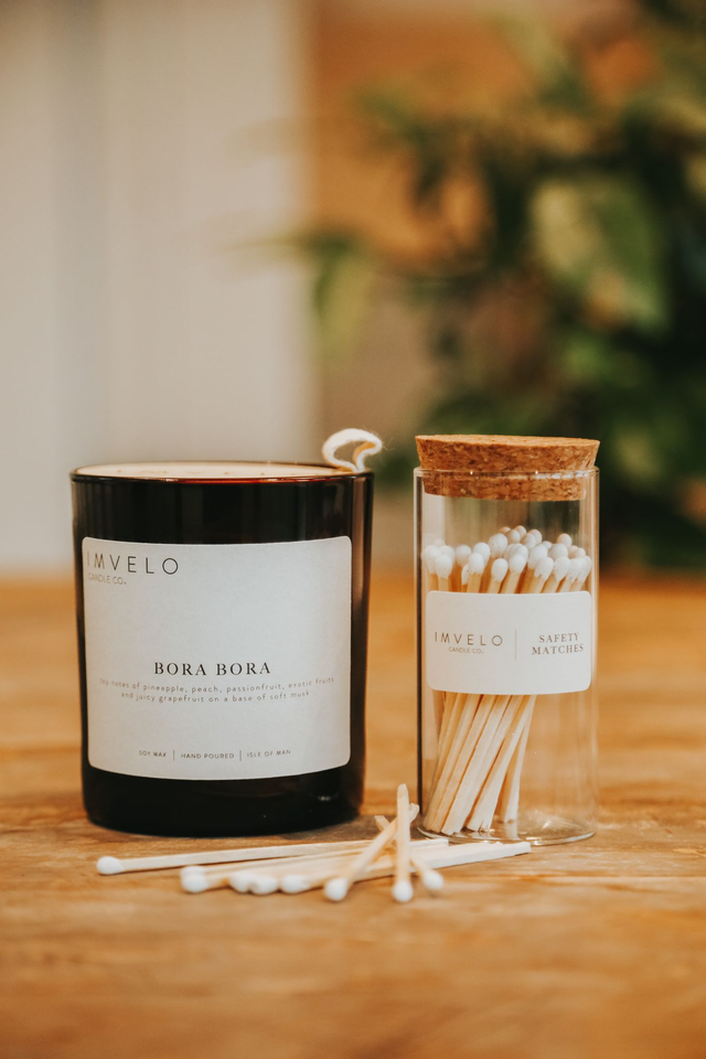 Presented in a reusable glass jar with a cork lid topper, these extra long white tipped safety matches are the perfect companion for your Imvelo candle. Not only are they rather cute and go well with most décor but they also work well as an accessory gift for any candle lover.